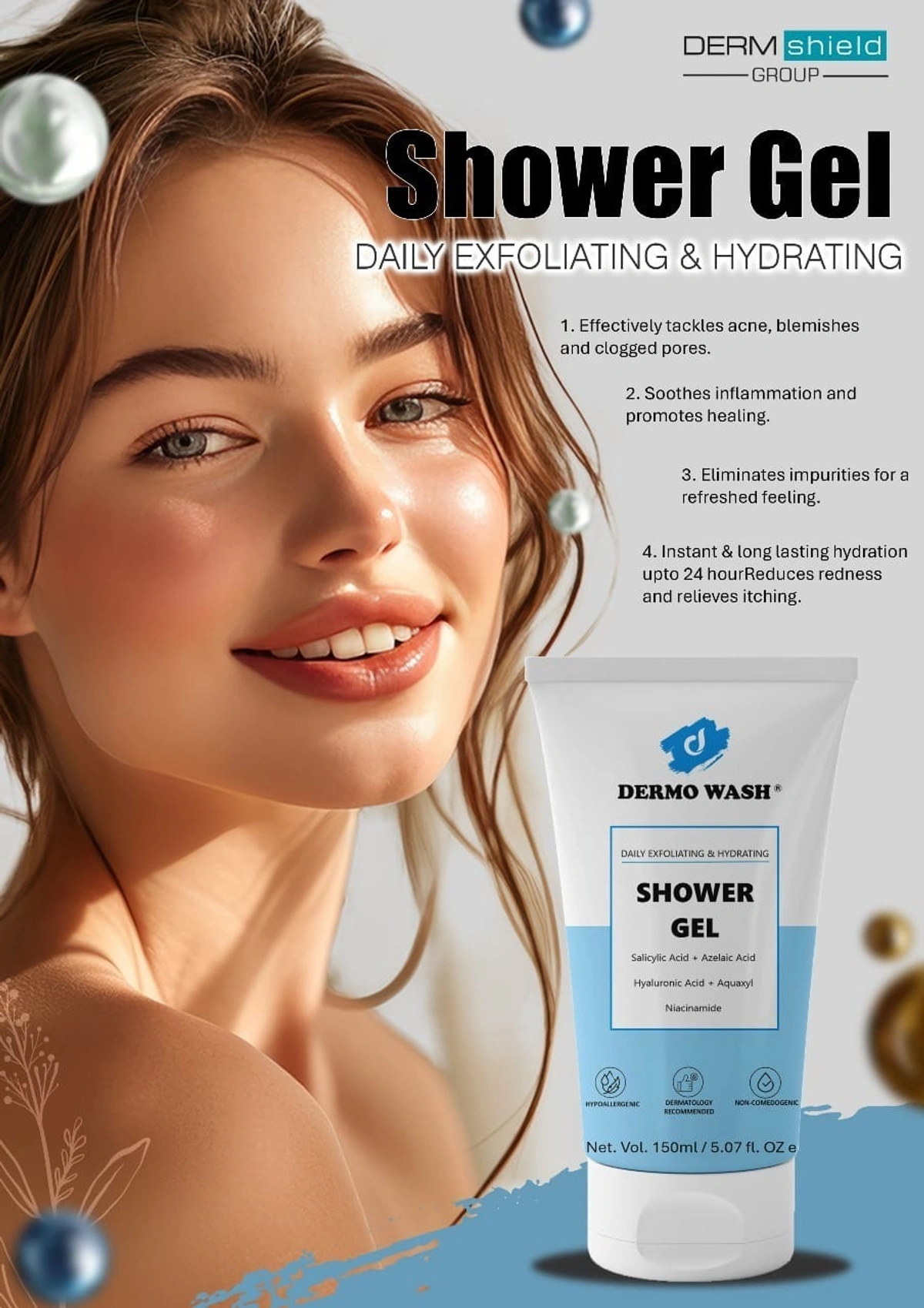 Dermowash Shower gel is a liquid cleanser with a firm, jelly-like texture designed to remove dirt, sweat, and oil. Unlike creamy body washes, shower gels are typically water-based and often provide a more intense fragrance and a "squeaky clean" feel, making them ideal for oily skin or humid climates.