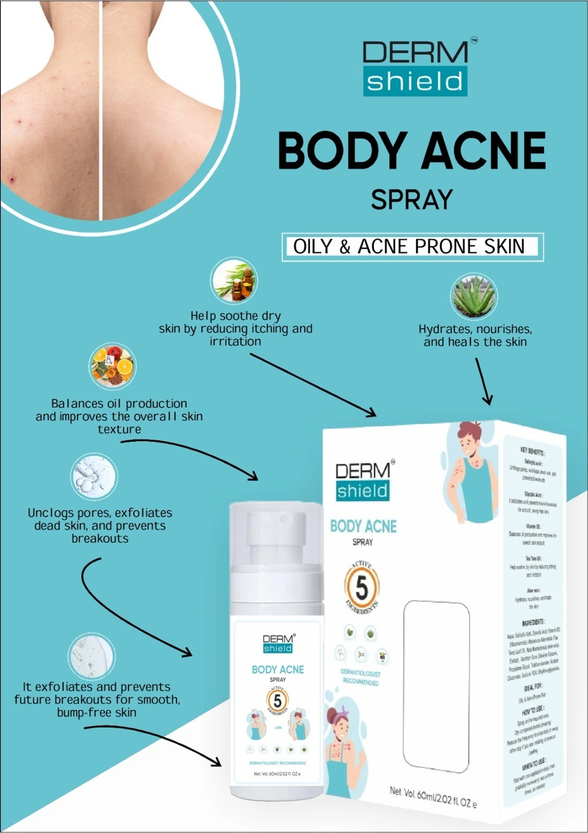 Dermshield Body acne sprays are a popular and effective way to treat breakouts on hard-to-reach areas like the back (bacne), chest, and shoulders. Most sprays feature a 360-degree nozzle that allows you to spray upside down for full coverage